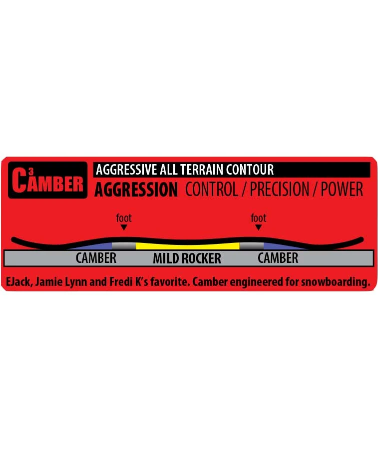 The side profile of camber looks like a rainbow. Tried and true, camber has been the dominant board bend in the snowboard industry for almost 40 years. Adopted from the bend of alpine skis, camber snowboards deliver precise turning and edge control, with spring-loaded pop due to the bend in the board, providing better jumping characteristics. Advanced riders tend to prefer this bend, especially for hard carving and high-speed riding. Even when it comes to softer park snowboards, camber boards deliver exceptional pop and control.